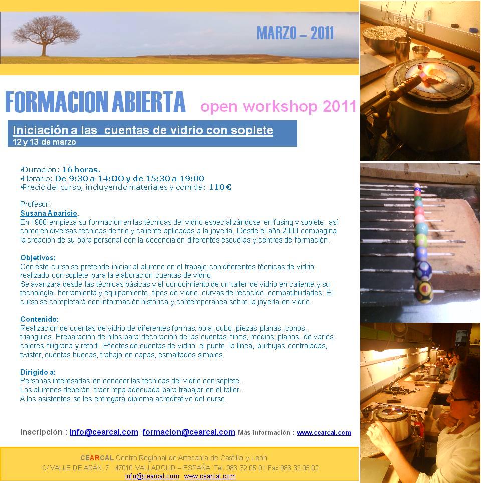 ÚLTIMAS PLAZASCEARCAL pone en marcha su programación de cursos Openworshop 2011.Os adjuntamos el programa previsto para el fin de semana del 12 y 13 de marzo:Iniciación a las cuentas de vidrio con soplete, impartido por Susana Aparicio Ortiz (http://myspace.com/sussanglass). El worshop está dirigido a todos aquellos que quieran conocer como se trabaja el vidrio en caliente, realizado con soplete para la producción artesana de cuentas de collar.Los interesados pueden ponerse en contacto con:Henar Asensio GonzálezAdministraciónCentro Regional de Artesanía de Castilla y LeónC/ Valle de Arán nº 7. 47010 Valladolid - EspañaTel. +34 983 32 05 01 Fax . +34 983 32 05 02