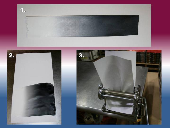 Imágen 1: arriba se muestran los seis paquetes aplastados. El envoltorio de celofán despegado como la piel de un diente de ajo machacado. Después laminé las pastillas individualmente, finalmente agrupé las tres pastillas del mismo color, tal y como se muestra en la Imagen 2. Fue importante limpiar los restos de masa de los rodillos de la laminadora después de pasar cada color. Tal como puedes ver en la Imagen 3 hice una plancha blanca y otra negra de aproximadamente 24 pulgadas de longitud (61 cm aproximadamente).